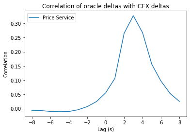 where $Lag^*_{a,b}$ indicates the optimal lag—i.e. that lag that produces the max correlation—between price feeds at $a$ and $b$. We therefore plot the correlation as a function of lag 1) between CEX and Pythnet and 2) between Pythnet and the price service. We find that the optimal lag is 1 second for CEX-to-Pythnet and 2 seconds for Pythnet-to-price service. This indicates that the Pythnet prices exhibit about 1 second of latency relative to Binance and that there is about 2 seconds of latency (introduced by Wormhole) to get to the price service. Moreover, this is consistent with our lag estimate of about 3 seconds for CEX-to-price service.