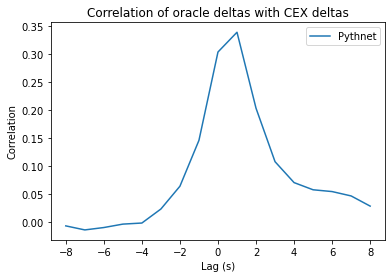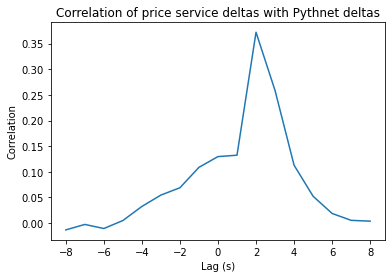 To obtain a more granular breakdown of the latency, we can also examine the optimal correlation and lag between the CEX and Pythnet and between Pythnet and the price service. Intuitively, we should observe that