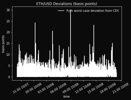 10/7 8:00 PM - 10/9 9:00 PM. During this subperiod, Pyth worst case avg. deviation is $0.27 (2.1 bps).